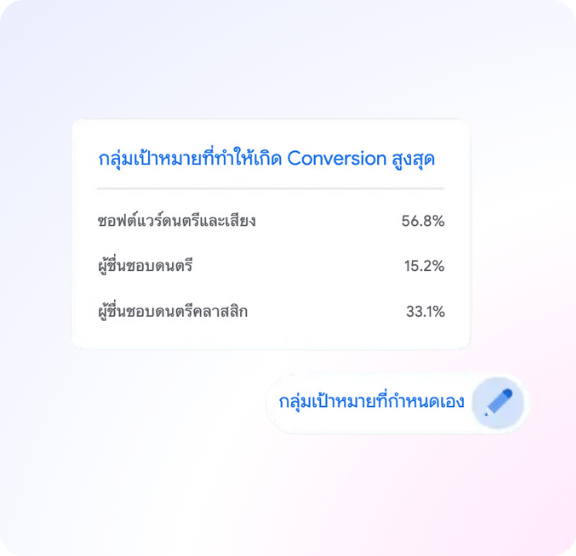 ทีมผู้เชี่ยวชาญของเราจะออกแบบกลยุทธ์ Performance Max โดยเลือกประเภทแคมเปญที่เหมาะสม กำหนดกลุ่มเป้าหมาย ตั้งค่าการเสนอราคา และจัดการงบประมาณ