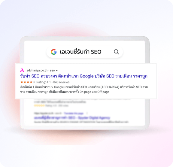 ที่ติดหน้าแรกกว่า 84%เว็บไซต์ของคุณหายากบน Google? อันดับต่ำ ดึงดูดลูกค้าไม่ได้? เสียเวลา เสียเงิน ทำ SEO เองแล้วไม่เห็นผล? ให้ผู้เชี่ยวชาญด้านรับทำ SEO ของแอดฉริยะช่วยคุณ ด้วยประสบการณ์ที่เราอยู่เบื้องหลังความสำเร็จทั้ง SEO Ecommerce, SEO คลินิกทุกประเภท และ SEO ธุรกิจ B2B มาแล้วกว่า 200 เว็บไซต์ เราช่วยให้เว็บไซต์ธุรกิจติดหน้าแรก Google กว่า 85% การันตีผลลัพธ์การทำ SEO ใน 90 วันแรก เพื่อให้เว็บไซต์ของคุณมีอันดับเหนือคู่แข่ง เพิ่มโอกาสการขาย ทะยานสู่ความสำเร็จแบบยั่งยืน