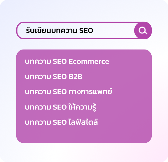 บทความ SEO ทุกประเภทธุรกิจไม่ว่าธุรกิจของคุณจะเป็นประเภทไหน เรามีความเชี่ยวชาญในการเขียนเนื้อหาที่ตรงใจกลุ่มเป้าหมายและช่วยให้เว็บไซต์ของคุณติดอันดับบน Google ได้เหนือคู่แข่ง เพราะทีมนักเขียนของเราเปี่ยมไปด้วยประสบการณ์ในการเขียนคอนเทนต์หลากหลายประเภท ไม่ว่าจะเป็น บทความให้ความรู้ บทความไลฟ์สไตล์ บทสัมภาษณ์ รีวิว ข่าวสาร รวมถึงมีความรู้และความเชี่ยวชาญในหลากหลายแวดวงธุรกิจ เช่น การงานเขียนบทความเชิงลึก เกี่ยวกับบทความ SEO ทางการแพทย์ SEO Ecommerce หรือ บทความ SEO สำหรับธุรกิจ B2B ได้ออกมาอย่างมีประสิทธิภาพ เพราะทีมนักเขียนของเรามุ่งมั่นใส่ใจรายละเอียดทุกขั้นตอน ตั้งแต่การค้นคว้าข้อมูล การเขียน การตรวจทาน และแก้ไข เพื่อให้มั่นใจว่าบทความของคุณมีคุณภาพสูงสุด